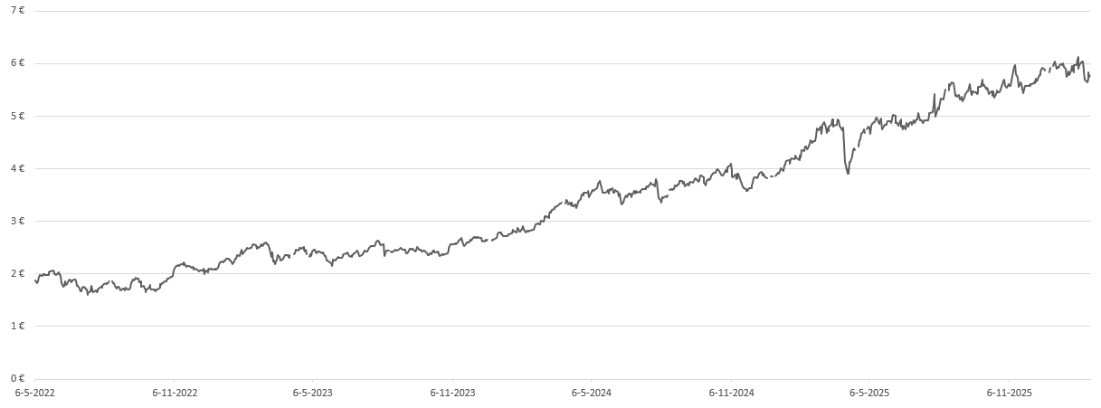 Ook aan de aandeelhouders denkt de bank royaal. Tussen 2025 en 2029 wil Intesa naar schatting €50 miljard teruggeven via dividenden en aandeleninkoop. Jaarlijks keert het concern ongeveer 95% van de winst uit, waarvan 75% in contanten (ongeveer 6% dividendrendement over 2025) en 20% via aandeleninkoop. Worden de doelen gehaald, dan stijgt de winst per aandeel met circa 9% per jaar, aangevuld met een dividendrendement van zo’n 7% – samen goed voor een totaalrendement van ruim 15%. Dat potentieel is nog slechts beperkt verdisconteerd in de huidige beurskoers.