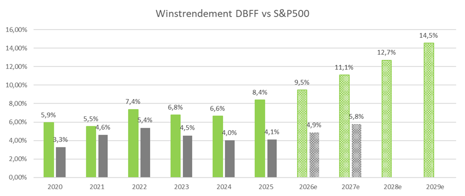 Aangezien de koers is gedaald terwijl de bedrijven wel uitstekend presteren is het winstrendement toegenomen. In de onderstaande grafiek zie je dat analisten verwachten dat de bedrijven in de portefeuille in 2026 9,5% winst maken. De verwachting dat de bedrijfswinsten in 2027 en 2028 verder stijgen, waardoor het winstrendement stijgt naar 11,1% in 2027 en 12,7% in 2028. Dat is aanzienlijk hoger dan het verwachte winstrendement van de S&P 500 dat in 2027 op 5,8% ligt.