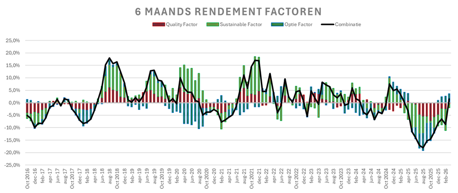 Een combinatie van de drie factoren heeft op lange termijn +/- 3% meer rendement per jaar opgeleverd dan de wereldwijde aandelenindex met +/- 15% minder maximaal verlies (50% daling wordt 35%). Helaas zijn er ook periodes dat de strategie achterblijft zoals in 2025. Dat is het risico dat je loopt voor het extra rendement en de lagere drawdown. In het verleden zijn er vaker periodes geweest waarin de factoren achterblijven bij de index en in iedere situatie is die achterstand weer ingelopen. Anders zou het gemiddelde rendement immers veel slechter uitkomen.