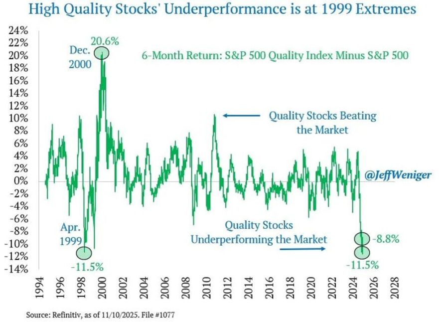 De onderstaande grafiek toont het rendementsverschil over 6 maanden voor kwaliteitsaandelen. De huidige underperformance is uitzonderlijk groot en slechts één keer eerder voorgekomen: in 1999. Destijds werd de negatieve periode gevolgd door een uitzonderlijk positieve periode voor kwaliteitsaandelen waarin de underperformance ruim werd goedgemaakt.