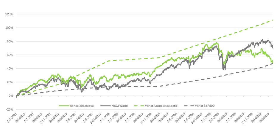 In de onderstaande grafiek zie je de ontwikkeling van de koers ten opzichte van de winstontwikkeling. In de grafiek is gerekend met een waardering van 18 keer de winst. Je ziet dat de koers van de aandelenselectie (groene lijn) bijna 40% is achtergebleven bij de ontwikkeling van de winst (groene stippellijn). Voor de S&P 500 is dat juist andersom. De grijze lijn van de koers staat aanzienlijk hoger dan de grijze stippellijn van de winst.