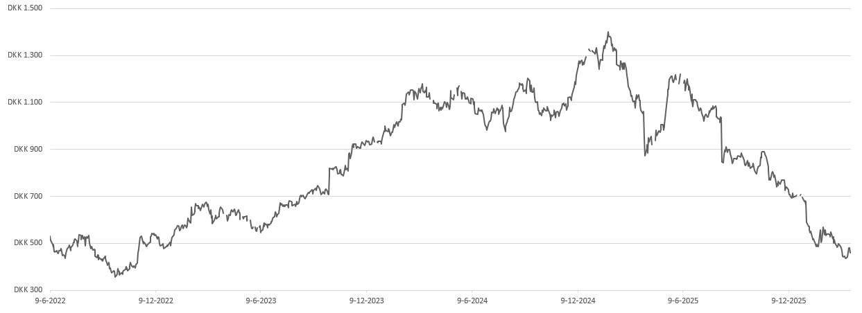 Analisten houden rekening met een zwakkere groei op korte termijn en margedruk als gevolg van stijgende grondstofprijzen. Daarnaast is het consumentenvertrouwen gedaald, met name in Pandora’s grootste afzetmarkt de Verenigde Staten. De koers van het aandeel is sinds de recordstand in januari 2025 van DKK 1400 met bijna 70% gedaald tot ca. DKK 460 (maart 2026). Analisten verwachten dat de winst per aandeel in 2026 met ruim 10% gaat dalen en hanteren desondanks een gemiddeld 12-maands koersdoel van DKK 614, wat een potentieel rendement van ca. 35% vanaf het huidige niveau inhoudt. Gegeven de winst per aandeel van DKK 68, handelt het aandeel momenteel tegen slechts 7 keer de winst.